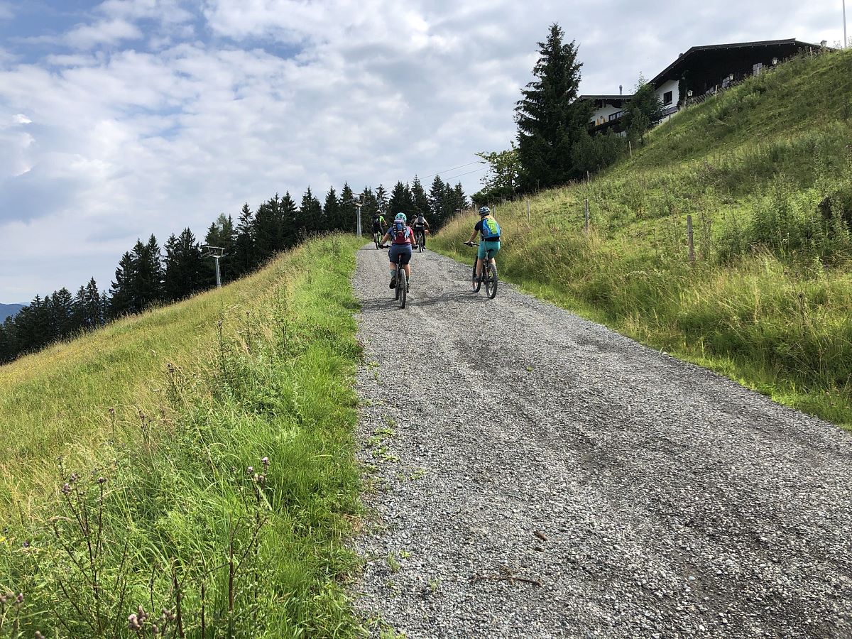 Start ist um kurz nach 9 Uhr - und schon eine Stunde später, bei der ersten größeren Trinkpause, blicken wir bereits vom Aussichtsplateau hinter der Wiegalm auf das Skigebiet von Kirchberg. Wir haben doch tatsächlich innerhalb einer Stunde 700 Höhenmeter hinter uns gelassen, dank der Eco-Power des E-Bikes. Von 800 auf 1513 m in einer runden Stunde! Trotzdem schwitzen wir aus allen Poren. Unser Guide Kurt hat uns eingeschärft, nur im Eco-Modus zu fahren, wenn wir das Etappenende in Oberndorf noch bei halbwegs gefülltem Akku erleben wollen - also hat unser E-Ausritt auch jede Menge mit Sport zu tun, wenn auch wohldosiert.