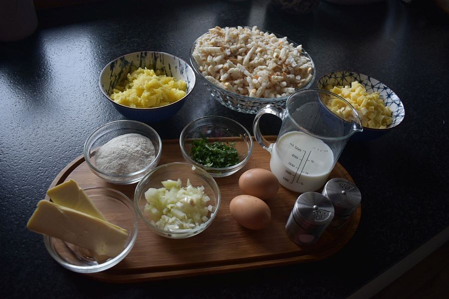 Jetzt alle Zutaten (Mehl, Zwiebel, Eier, Salz, Petersilie, Käse) vermischen.