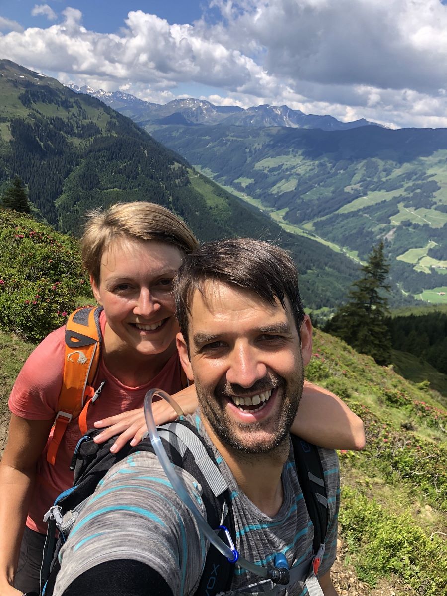 Kamera an! Heute werden wir von einem Filmteam der Kitzbüheler Alpen begleitet und wir sind tatsächlich ein bisschen aufgeregt. Daher nehmen wir nur ein schnelles Frühstück zu uns und legen direkt los. Diese Etappe ist wirklich wunderschön! Zahlreiche Almrosen und sattgrüne Wiesen erwarten uns. Immer entlang von einsamen Pfaden mit herrlichen Ausblicken. Zu gut, dass wir das ein oder andere Stück auf Grund der Aufnahmen gleich zweimal zurücklegen dürfen – so haben wir genug Zeit das wunderschöne Alpenpanorama zu genießen. Auf dem höchsten Punkt legen wir eine kleine Jause ein und werden hinsichtlich der Wanderung interviewt. Zunächst ein bisschen nervös schlagen wir uns doch ganz gut für unser erstes offizielles Interview. 🙂 Nun geht es nur noch locker bergab, vorbei an einem sehr schönen Bergsee, durch einen kleinen Schneeabschnitt und entlang von Wiesen mit rastenden Kühen und Pferden. Einfach schön diese unendliche Ruhe! Kurz vor Schluss legen wir noch eine Rast in der Labalm ein, um uns eine leckere Süßspeise zu gönnen. Apfelstrudel mit Vanilleeis und Marillenknödel – mhhh, ein Traum nach diesem anstrengenden Tag! Gut gestärkt geht’s weiter abwärts bis wir unser Etappenziel – Aschau – erreichen. Und da die Beine nun doch ein bisschen schwer sind, nutzen wir noch die öffentliche Kneippanlage, um uns zu erfrischen. Ok, zugegebenermaßen war es für Matze teilweise ein bisschen zu kalt, ich habe die Becken jedoch wahrlich genossen. Und der KAT Walk wäre nicht der KAT Walk, wenn uns nicht wieder eine wunderschöne Unterkunft erwartet, in der wir den Abend müde aber glücklich ausklingen lassen können. Mal schauen, was uns morgen bevorsteht….