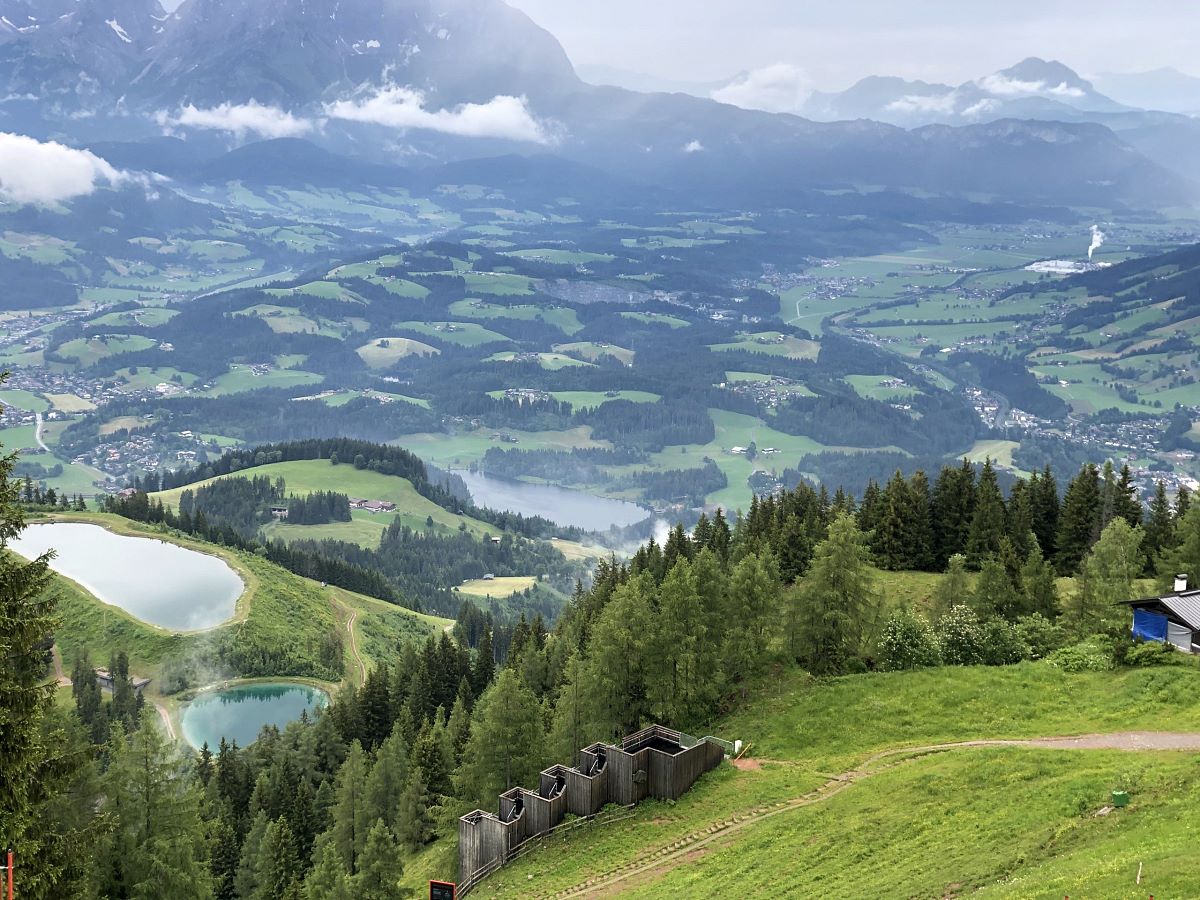 Der letzte Teil des Abstiegs führt uns entlang von Wiesen, einsamen Forstwegen und durch malerische Waldpassagen. Ziemlich erschöpft aber sichtlich stolz kommen wir schließlich in St. Johann in Tirol an. Wie freuen wir uns auf eine erfrischende Dusche und ein kühles Getränk… Welch Glück, dass unser Hotel direkt am Wanderweg liegt.