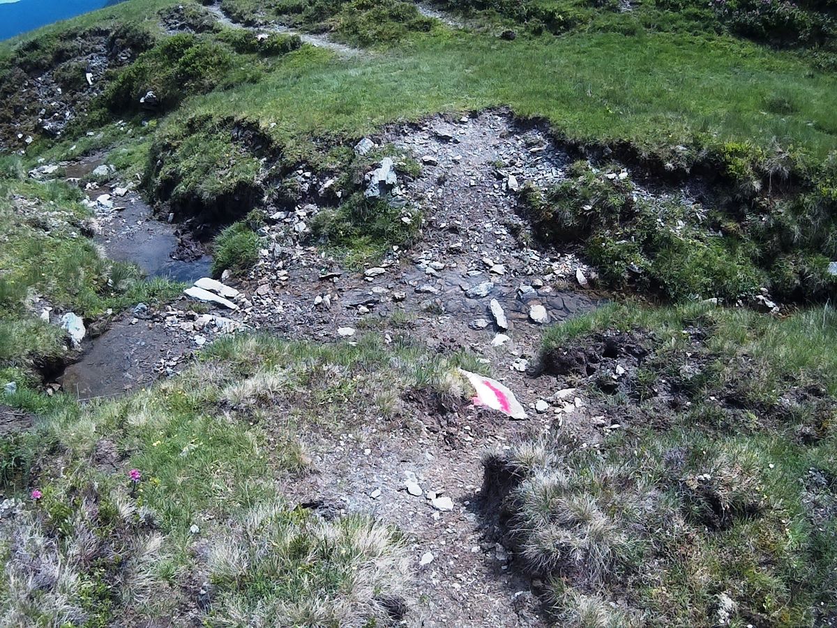Der Blick auf die Alm ist ein Traum. Umgeben von Bergwiesen, direkt neben einem Quellbach! Ich habe mich gefühlt wie Heidi! Hinter der Alm geht wieder das anstrengendste Stück der Etappe nach oben. Ein Bergsteig durch die Almwiesen, vorbei an vielen Almrosen und anderen schönen Blumen. Nochmal ein Grund mehr, sich wie Heidi zu fühlen.