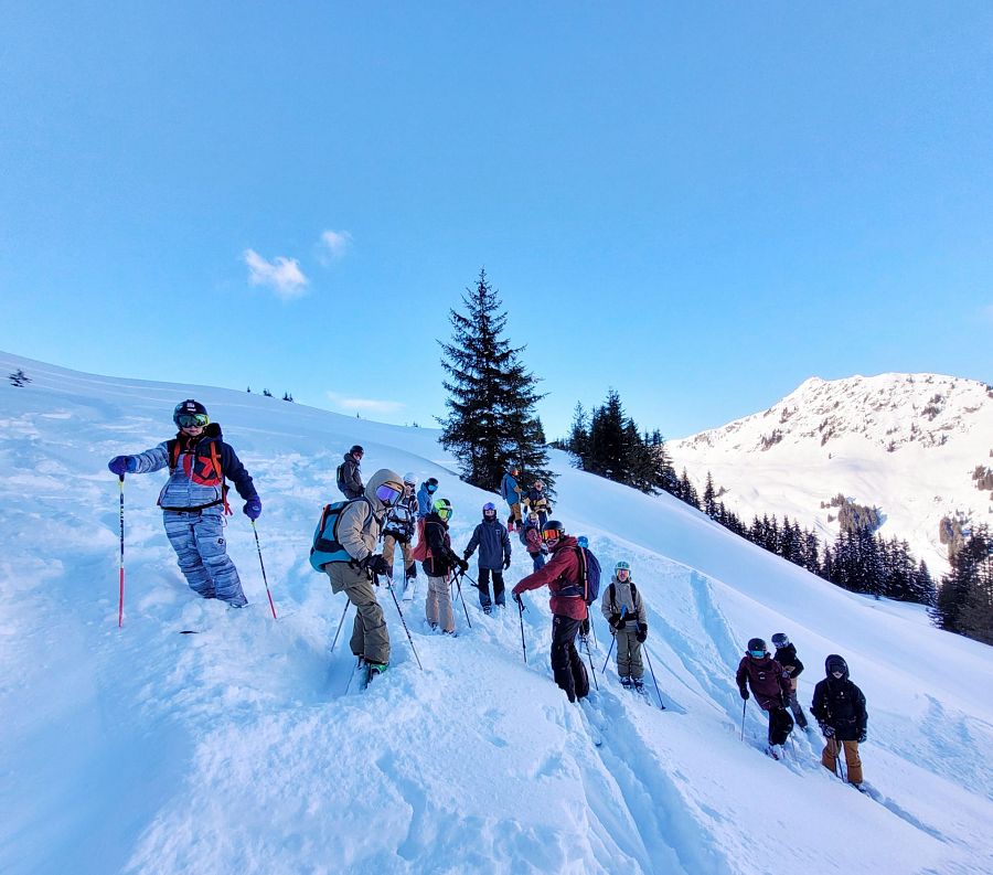 © Didi TenggGemeinsam lernen, gemeinsam wachsen: Schülerinnen und Schüler auf ihrem Weg durch die verschneite Landschaft, bereit für die spannenden Lektionen im Freeriden und den Respekt vor der Natur.