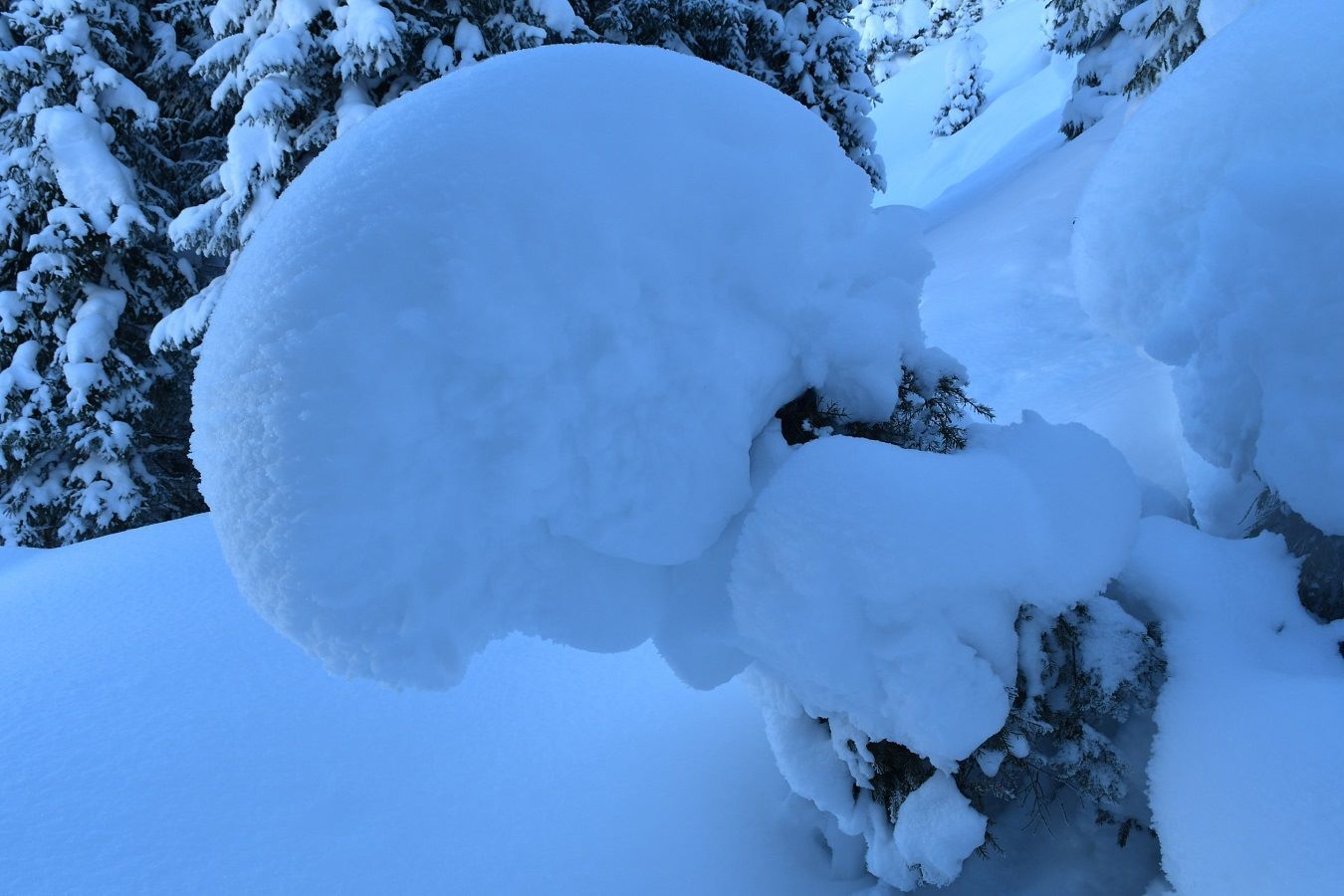 Und so spure ich an einem eisig kalten, wenngleich traumhaft schönen Hochwintertag von der Erla-Brennhütte durch den metertiefen Schnee hinauf Richtung Bärentalkopf. Ein überaus lohnendes Ziel mit grandiosen Abfahrtshängen, das schon lange auf meiner To-Do-Liste stand. Zumindest seit ich das erste Mal aus dem Langen Grund auf den Schafsiedel gegangen bin und von dort sehnsüchtig hinübergeschaut habe auf diese XXL-Hänge, die so viel Platz bieten, dass man auch nach einer längeren Schönwetterperiode noch unverspurtes Terrain findet. Beim Aufstieg zeigt sich der Winter in seiner ganzen Schönheit: Die jungen Fichten verstecken sich unter riesigen Mützen aus Schnee, die Äste der großen Bäume schwer beladen, die Nadeln zieren feinste Eiskristalle und sobald ich vom Schatten in die Sonne wechsle, glitzert die Schneedecke wie eine riesige Swarovski-Auslage.