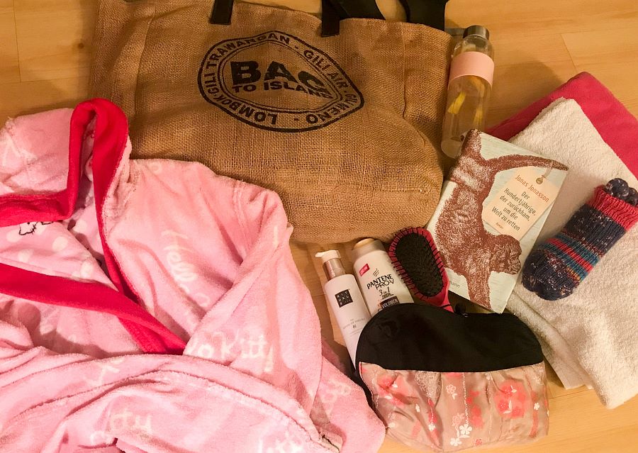 Although it is common knowldedge that there isn’t a lot you need in a sauna, my bag is loaded. Two large towels, bathrobe, handmade socks knitted by Granny, shower stuff, flip-flops, book (although in vain since it is girls’ night which means a lot of talking) and one litre of ginger-lemon water.