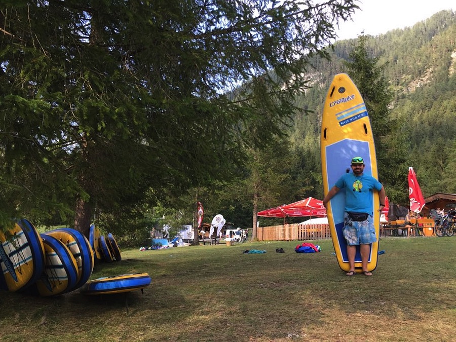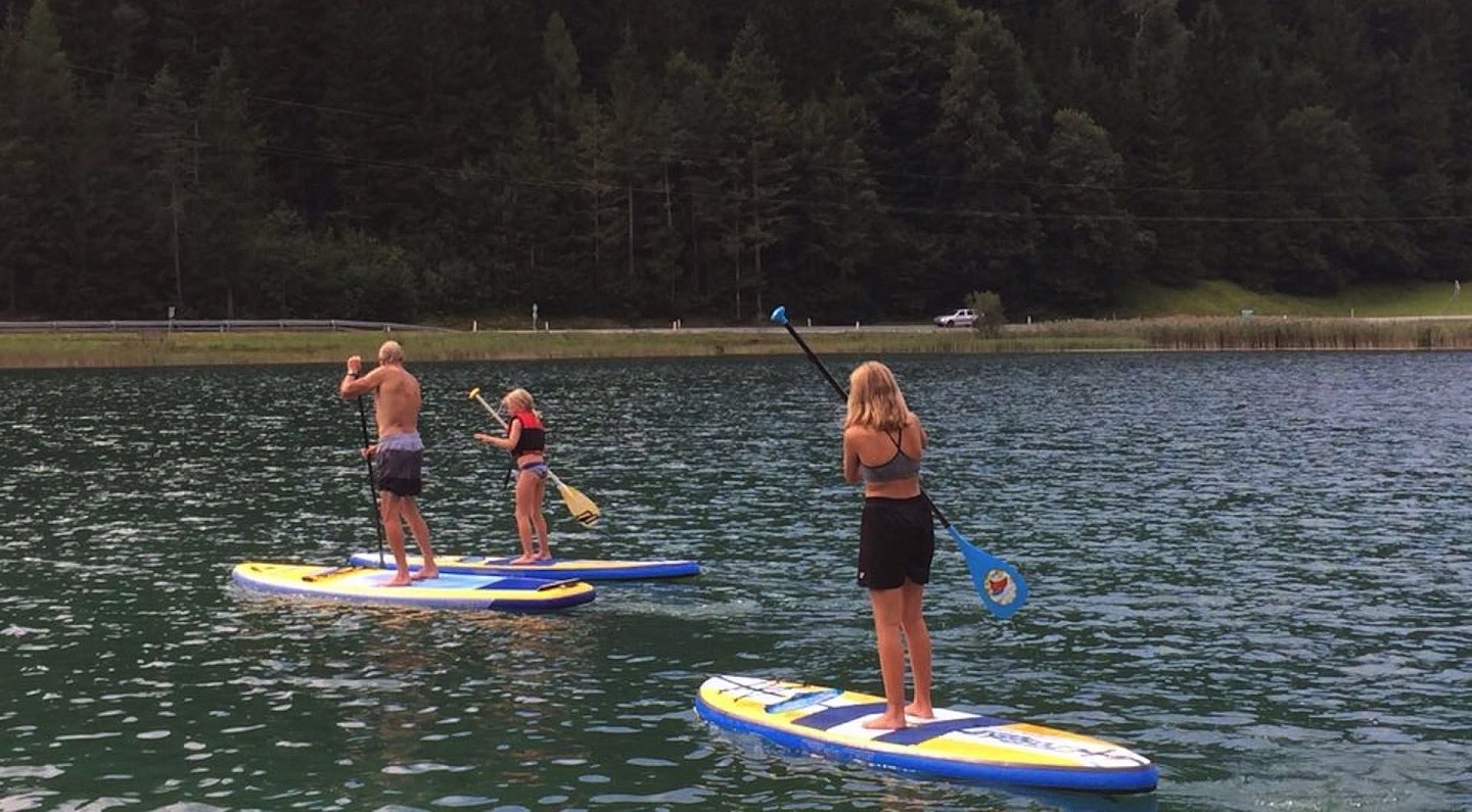 © Hajo SmitStaand op een plank peddelen is een enorme hype. Ooit begonnen op Hawaii waar fotografen het deden om de surfers te kunnen kieken. Nu door jong en oud gedaan op zee maar ook op meren en op sloten. In Oostenrijk had ik het al eens mogen doen. Ook in het Pillerseetal en wel op de Wildseelodersee op 1900m. Zie mijn artikel van toen. Daarbij leerde ik de Vlaming Danny Bulthe van Sup 'n Fun kennen die toen zijn opblaasbare boards de berg op had gesleept. Nu zijn we te gast bij hem op zijn thuisstek, zijn "nieuwe thuis"-stek dan, de Pillersee. Wat ik niet verwacht had.... dat het watervan de Pillersee in deze droomzomer nog zo fris zou zijn! Bijna niemand zwemt er. Ik wel want ik ben liefhebber van koud water zowel onder de douche als in de natuur. Na die opfrisser stap ook ik op een door Danny aangereikte SUP en ga ik de kids achterna die met een pittige dalwind een flink stuk vooruit zijn gepeddeld. Terug naar Danny's station is dan nog even een echte workout vooral omdat ik mijn dochter achter me aansleep die het tegen de wind heeft opgegeven. Na gedane arbeid is het heerlijk op het groene grazige "strandje" in de zon lekkerte ontspannen en bruin te bakken. Met deze twee activiteiten een perfecte welbestede dag!