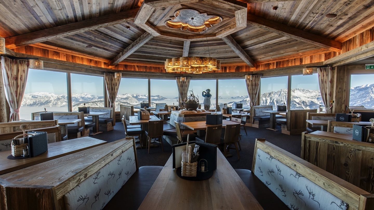© Sportalpen GmbHZoals de naam al een beetje verraad, staat het panoramarestaurant direct op de top van de Hohe Salve. Het is zo groot als een gasthof, maar gezellig als een kleine berghut. In meerdere zalen kiest u tussen zelfbediening en bediening. De “Gipfelalm“ is als sinds 1941 in het bezit van de familie Ager, en de familiaire gastvrijheid voel je al, als je het imposante gebouw betreedt. Peter Ager vertelt me over zijn idee voor de “Umadum Stube” op de Hohe Salve. „Van hierboven af, zie je 73 bergen van 3.000m+. En het maakt niet uit welke kant je op kijkt, het bergpanorama is fantastisch. We wilden dat iedere gast daar van kan genieten en zo zijn we op het idee gekomen om een draaibaar terras te bouwen en later ook het draaibare restaurant – de Umadum Stubn.“ Sinds het begin van december 2016 zijn de poorten van Oostenrijks hoogstgelegen draaibare restaurant met 70 zitplaatsen geopend. En niet alleen het uitzicht is indrukwekkend, ook de authentieke sfeer die door het oude hout bepaald wordt en de heerlijke menukaart kunnen zich laten zien.